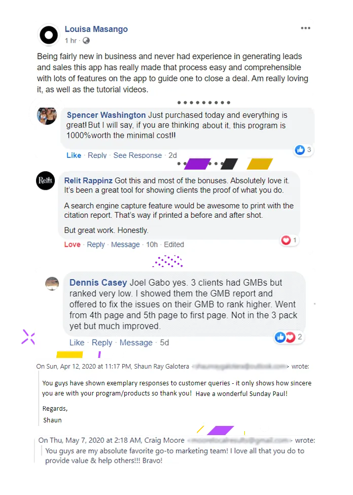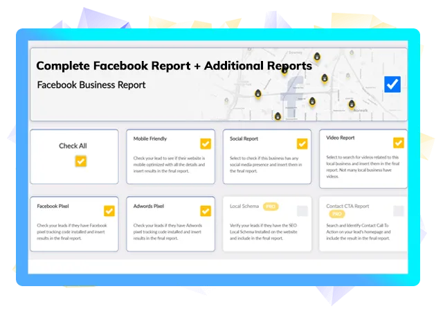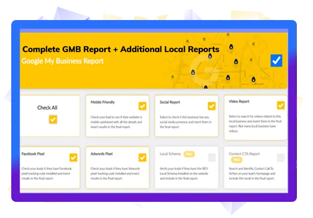 All-in-One Features - First to have lead finding from Google & FB, 4 different types of PDF report generation, and email marketing w/ DFY proven swipes all in the front-end offer (like a DFY lead gen agency)