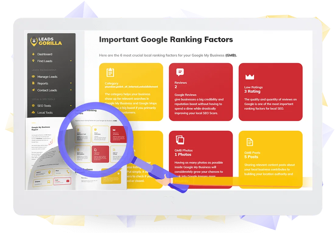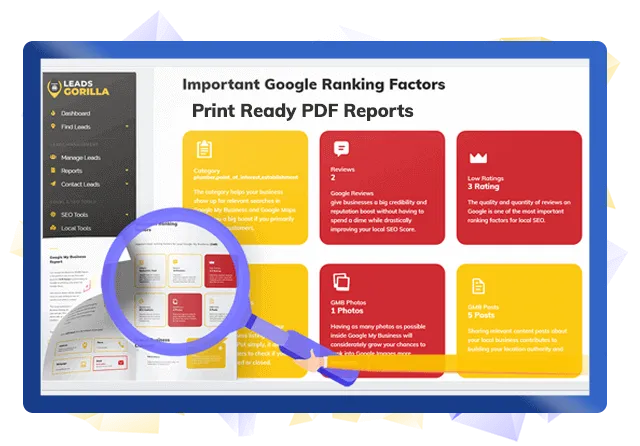 Optimize local businesses and help them regroup after the crisis. LeadGorilla's smart-technology knows exactly what needs to be provided and fixed which you can show them in our print-demand ready reports.